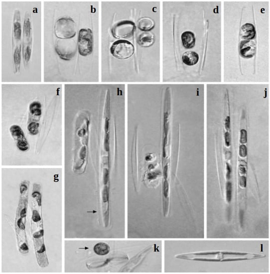 Stages of sexual reproduction in Haslea silbo (×400 magnification). (a) A pair of sexually compatible gametangial cells. (b) Gametes have been formed and swelled in the left and are still to be formed in the right gametangial cell. (c) Two gametes have been formed in each gametangial cell and are ready to fuse. (d) Two zygotes resulted from gamete fusion. Note two opened gametangial frustules (four thecae). (e) A pair of gametes in a separately lying gametangial cell may be confusingly understood as a pair of zygotes, but note that only two thecae are present in this case. (f,g) Growing auxospores. (h) Initial cell (right) formed in the envelope of the fully grown auxospore (arrow); development of the next auxospore is tardy. (i) One initial cell and destroyed auxospore. (j) Two normally developed initial cells. (k) A zygote (arrow) and two aborted gametes (below), swelled due to osmotic pressure. (l) A vegetative cell.
