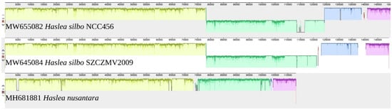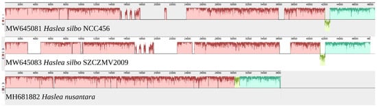 MAUVE alignment of the mitochondrial genomes of Haslea silbo NCC456 (MW645081), Haslea silbo SZCZMV2009 (MW645083), and Haslea nusantara (MH681882).