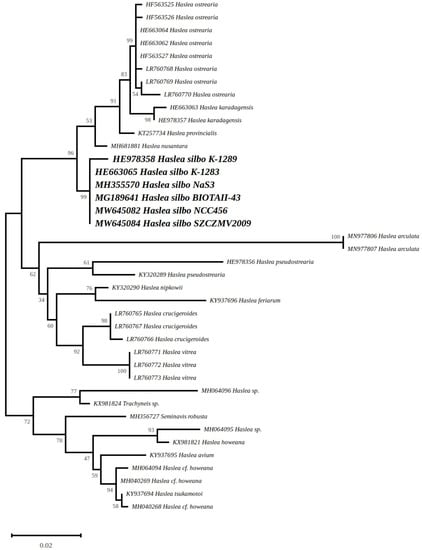 - Stamatakis, A. RAxML Version 8: A tool for phylogenetic analysis and post-analysis of large phylogenies. Bioinformatics 2014, 30, 1312–1313. [Google Scholar] [CrossRef] [PubMed]