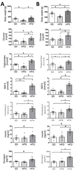 To characterize the effects of an HFD and HPD on the metabolic profile, in comparison to an SD, we measured the body mass and the concentrations of glucose, triglycerides, NEFA, and cholesterol in the sera of the rats treated with these diets (Figure 1).