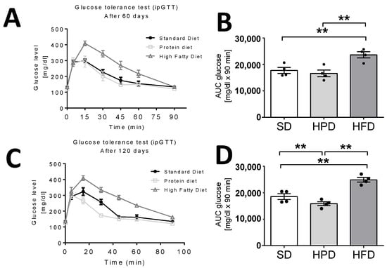 The effects of three different diets on glucose utilization rate (ipGTT) after 60 (A,B) and 120 days (C,D). (B,D) show mean areas under glucose curves. Results are means ± SEM for n = 4; significant differences are marked for p < 0.01 (**).