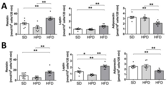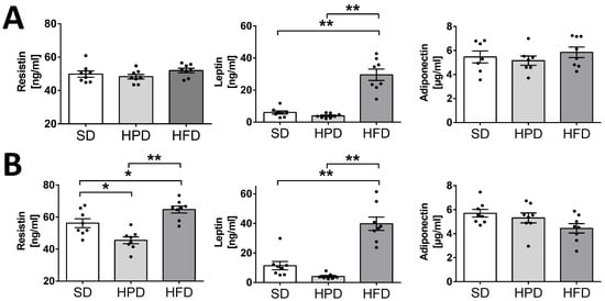 The effects of the standard (SD), HFD, and HPD on resistin, adiponectin, and leptin concentrations in blood serum after 60 (A) and 120 (B) days. Values presented are means and SEM for n = 8; significant differences between means for control and experimental groups are marked for p < 0.05 (*) and p < 0.01 (**).