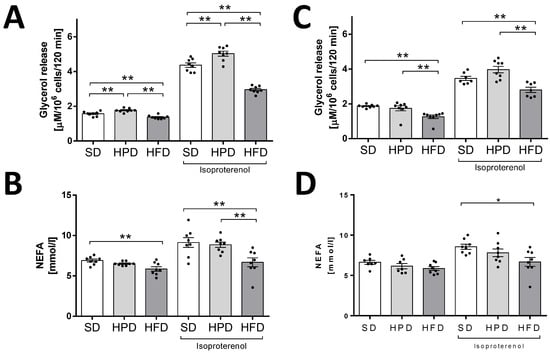 The effects of the standard diet, HFD, and HPD on basal and isoproterenol stimulated lipolysis in isolated rat adipocytes after 60 (A,B) and 120 (C,D) days. Intensity of lipolysis was measured as glycerol and NEFA release from cells into incubation medium. Results are means ± SEM for n = 8; significant differences between means for control and experimental groups are marked for p < 0.05 (*) and p < 0.01 (**).