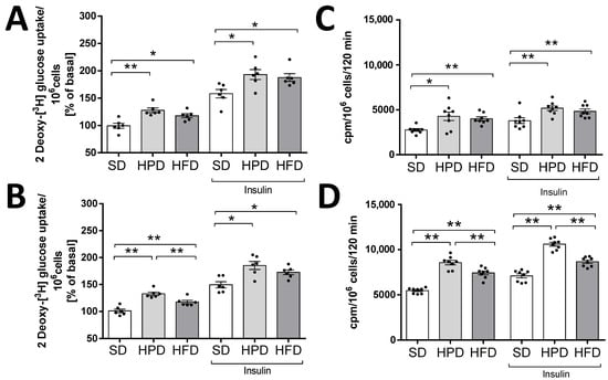 Similarly, there were increases in the rate of intracellular glucose uptake in the HFD and HPD groups compared to the control group (SD-fed rats) for both the basal and insulin stimulated processes. Furthermore, by analyzing the effect of using the HPD diet, we found that the rate of basal glucose transport to fat cells was significantly higher than that in the HFD group after 120 days of the experiment (Figure 6A,B).