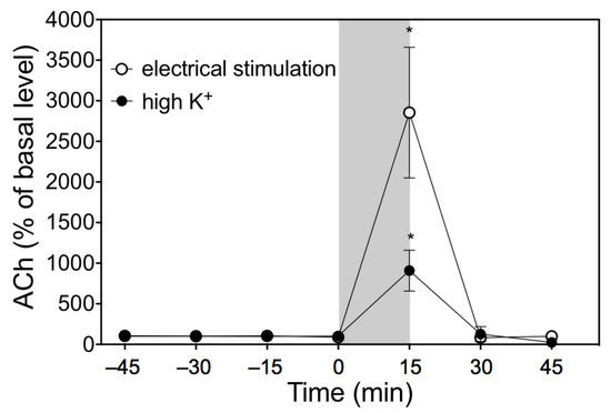 The effects of electrical stimulation of the chorda tympani nerve or perfusion with high-K+ Ringer’s solution on the acetylcholine (ACh) level in the dialysate. The solid grey bar indicates the length of electrical stimulation or perfusion with high-K+ Ringer’s solution. The values are means ± SD of 4 rats and are expressed as percentages of the basal level. Significantly different from the fraction at 0 min according to Dunn’s post-hoc test following Kruskal–Wallis test; * p < 0.05.