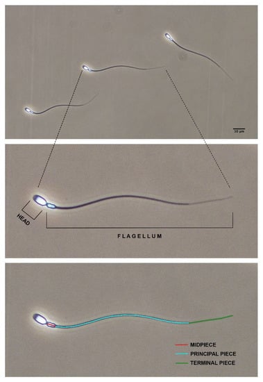 Sperm morphometry was assessed as previously described [46] with minor modifications. Briefly, an aliquot of sperm sample was fixed in 2% glutaraldehyde in phosphate-buffered saline (PBS) solution. A subsample of fixed sperm was used to make the smears, which were air-dried for one day before mounting. Pictures (resolution 2560 × 1920 pixels, TIFF format) were taken using a digital camera (Digital Sight DSFi1, Nikon, Japan) under a phase-contrast microscope (Nikon Eclipse E600, Japan; 40× objective). Pixel size was 0.14 µm in the horizontal and vertical axes. Sperm length was assessed using ImageJ software (US National Institutes of Health, Bethesda, MD, USA). The main structures of a bottlenose dolphin spermatozoon are shown in Figure 1. The following sperm morphometric parameters were determined in 25 spermatozoa per sample: head width (W) (µm), head length (L) (µm), head perimeter (P) (µm), head area (A) (µm2), midpiece length (µm), midpiece width (µm), principal piece length (µm), terminal piece length (µm), total flagellum length (µm) and total sperm length (µm). From the head parameters, the following shape factors were also determined, as previously reported [47]: ellipticity (L/W), rugosity (4πA/P2) and elongation [(L − W)/(L + W)].