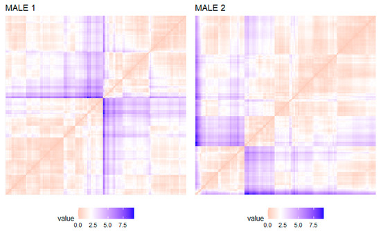 Quality of clustering based on Visual Assessment of the cluster Tendency (VAT) in sperm population of two bottlenose dolphin (Tursiops truncatus) (Male 1—left panel; Male 2—right panel). The cuvette visually detects the clustering trend by counting the number of square orange blocks along the diagonal in a cuvette image. Orange indicates high similarity (values close to 0), while blue indicates low similarity (values higher than 2.5).