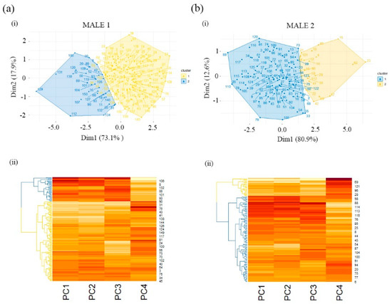 A clustering hierarchical tree (dendrogram) and heatmap from morphometric PC variables are depicted in Figure 3. Two clusters (blue and yellow areas in the graph) were identified in both males (Figure 3a(i),b(i)). The heatmaps provided similar results for spermatozoa similarity and dissimilarity to each cluster in Males 1 and 2 (Figure 3a(ii),b(ii)). In both males, cluster 1 (blue dendrogram) placed spermatozoa similarity in PC1, PC2 and PC3 and spermatozoa dissimilarity in PC4, and cluster 2 (yellow dendrogram) had spermatozoa dissimilarity in PC1, PC2 and PC3 and spermatozoa similarity in PC4 (Figure 3a(ii),b(ii)).