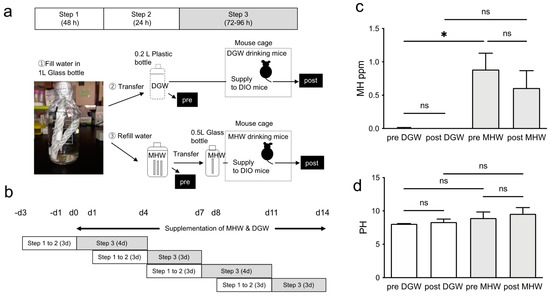 Preparation and supplementation of MHW. (a) MHW preparation and supplementation protocol with three MH supplier sticks (Dr Suisosui, FDR Friendear Inc., Shinjuku, Tokyo, Japan) and DGW for one cycle (a), and for the repeated cycles for 14 days (b). (c) MH concentration (ppm) at pre- and post-supplementation of MHW. n = 4 in each of the pre or post steps; * p < 0.05; ns, not significant. (d) pH levels at pre- and post-supplementation of MHW and DGW. n = 4 in each of the pre or post steps; ns, not significant.