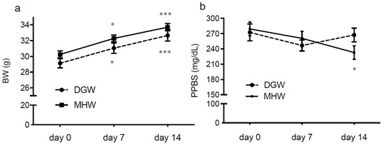 The transition of BW and PPBS in DIO mice treated with MHW vs. DGW for 2 weeks. BW (a) and PPBS (b) in DIO mice treated with MHW or DGW for 14 days. n = 12; * p < 0.05, *** p < 0.001 vs. day 0 in each group.