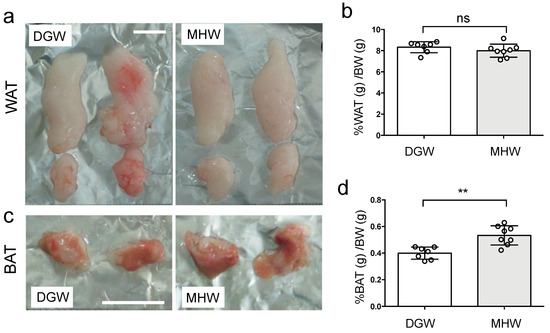 BW was similarly increased in both the DGW and MHW groups for the entire 2-week observation period, with % ratio of BAT mass to BW significantly increased in the MHW group and no change in the % ratio of WAT mass (Figure 2a, Figure 3).