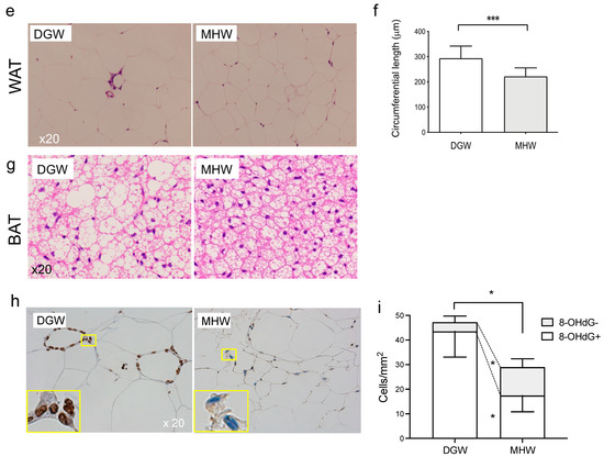 After continuous MHW supplementation for 2 weeks, there was no change in the WAT mass of DIO mice (Figure 3a,b), although the BAT mass increased by 1.3-fold (Figure 3c,d). The percentage of WAT weight per kg BW was 8.32% ± 0.52% in the DGW group and 8.00% ± 0.62% in the MHW group, whereas the percentage of BAT was 0.40% ± 0.05% in the DGW group and 0.53% ± 0.07% in the MHW group. The circumferential lengths of WAT adipocytes significantly shortened in the MHW group compared with the DGW group (221.9 ± 33.5 vs. 294.7 ± 46.5 μm, respectively) (Figure 3e,f), indicating that MHW intake was associated with a decrease in the size of WAT adipocytes in DIO mice. In other words, MHW intake was associated with the transition from unilocular (hypertrophic) to multilocular (hyperplasia) WAT adipocytes in DIO mice. Similarly, it changed the phenotype of BAT adipocytes from hypertrophic to hyperplastic (Figure 3g). Notably, 8-OHdG+ cells indicating ROS-induced DNA damage decreased (17.4 ± 6.6/mm2 vs. 43.5 ± 10.5/mm2) in the MHW group compared with that in the DGW group (Figure 3h,i, Table S4), whereas 8-OHdG- cells without the damage increased (11.6 ± 3.4/mm2 vs. 3.75 ± 2.5/mm2). These findings indicate that MHW intake alleviated the oxidative stress in WAT in DIO mice.