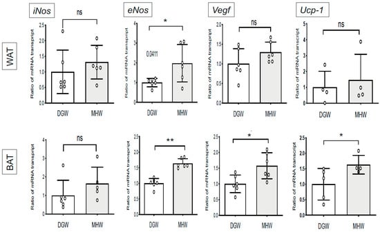 The genes expressed in BAT of DIO mice drinking MHW vs DGW for 2 weeks. Y-axis indicates the transcriptional ratio of expressing genes (eNos, Vegf, or Ucp-1) in WAT or BAT of DIO mice drinking MHW compared with DGW. The bar graphs show mean ± SD. * p < 0.05, ** p < 0.01; ns, not significant.