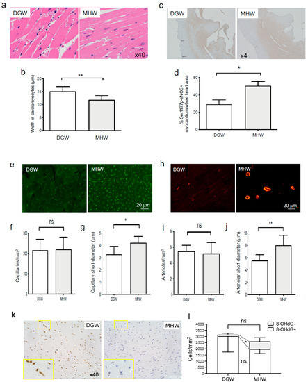 The LV area occupied by cardiomyocytes with phosphorylated Ser1177 of eNOS was significantly extended by 1.7-fold in the MHW group compared with the DGW group (50.5% ± 5.1% vs. 29.2% ± 5.1% per section, respectively) (Figure 5c,d).