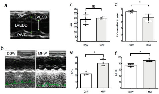 Cardiac function was assessed by echocardiographic measurement of the LV parameters, namely, SWT, LVEDD, LVESD, and PWT, in M-mode (Figure 6a,b). There was no significant difference in the heart rate between the two groups (Figure 6c, Table S7). Notably, the LV mass per g BW was decreased by 0.8-fold in the MHW group compared with that in the DGW group (3.64% ± 0.54% vs. 4.57% ± 0.20%, respectively) (Figure 6d, Table S7). The EF% significantly recovered in the MHW group compared with the DGW group (40.1% ± 5.54% vs. 22.8% ± 2.53%, respectively) (Figure 6e, Table S7), as did EF% (90.3% ± 4.1% vs. 75.3% ± 4.4% respectively) (Figure 6f).