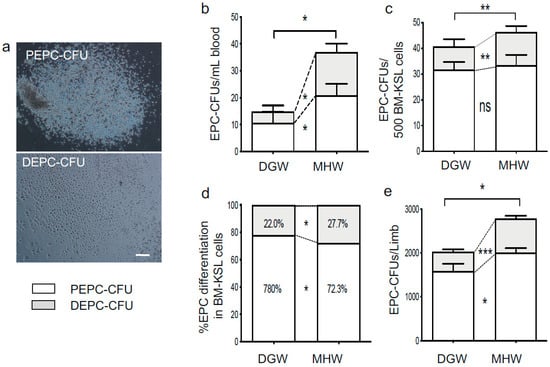 pEPC-CFUs, dEPC-CFUs, and total EPC-CFUs were increased by 2.0-, 4.0-, and 2.5-fold per mL of circulating blood, respectively, in the MHW group compared with those in the DGW group (Figure 7a,b, Table S8). The generation of dEPC-CFUs and total EPC-CFUs by 500 BM-KSL cells was 1.4- and 1.1-fold greater in the MHW group compared with the DGW group, whereas no significant difference was observed in the number of pEPC-CFUs (Figure 7c, Table S8). Further, the differentiation grade of EPCs from BM-KSL cells was calculated as the percentage of dEPC-CFUs of the total EPC-CFUs generated from 500 BM-KSL cells. The differentiation grade of EPCs was significantly higher in the MHW group than in the DGW group (27% vs. 22%, respectively) (Figure 7d, Table S8). pEPC-CFUs, dEPC-CFUs, and total EPC-CFUs from total KSL cells isolated from the right femur and tibia were increased by 1.3-, 1.8-, and 1.4-fold in the MHW group compared with the DGW group (Figure 7a,e, Table S8). These findings indicate that MHW intake restored EPC mobilization into the circulation as well as expansion and differentiation from BM-derived vasculogenic stem cells.