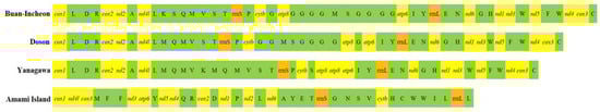 Gene organizations of Lingula anatina mitogenomes from Buan-Incheon (Korea), Doson (Vietnam), Yanagawa and Amami Island (Japan). Color indicators represent different groups: Yellow: Protein-coding genes, Green: tRNA genes, Orange: rRNA genes.