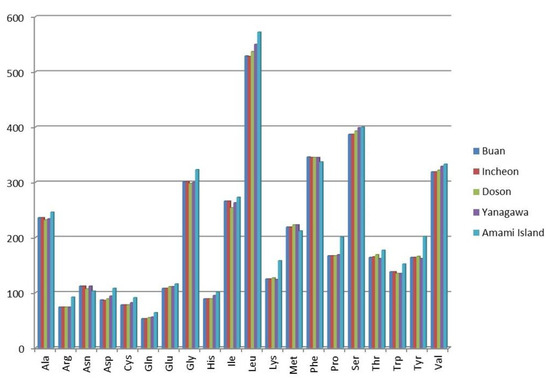 Amino acids corresponding to the codons of protein-coding genes of the Lingula anatina specimens. The specimens represented with localities: Buan, Korea (MW528457), Incheon, Korea (KX774482), Doson, Vietnam (MH371361), Yanagawa, Japan (AB178773) and Amami Island, Japan (KP881498).