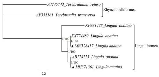 - Kim, S.G.; Karagozlu, M.Z.; Kim, C.B. Phylogenetic investigations of Lingula anatina among some northwestern Pacific populations, based on mitochondrial DNA cytochrome c oxidase subunit I gene. J. Asia Pac. Biodivers 2017, 10, 162–166. [Google Scholar] [CrossRef]