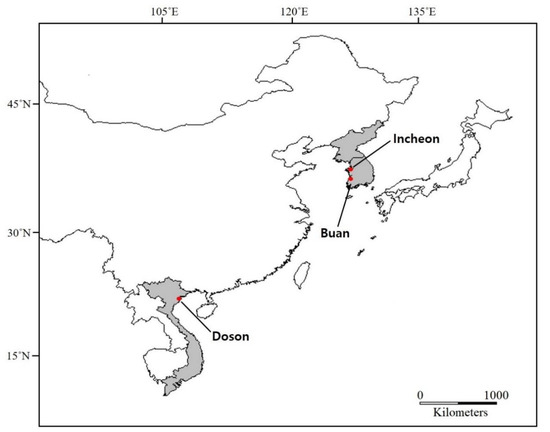 Map shows sampling localities in this study: Buan and Incheon (Korea) and Doson (Vietnam).