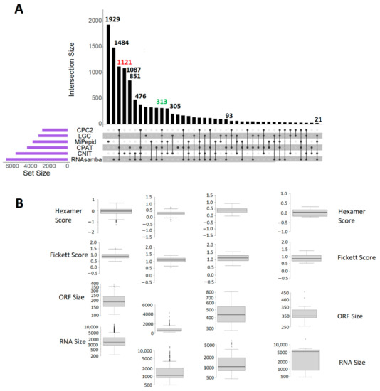 In fact, as many as 1121 lncRNAs were predicted to be coding by five tools (excluding MiPepid) (Figure 1). The main reason behind the poor overlap with other five is MiPepid’s restriction of ORF size between 6 and 303 nucleotides. However, the rest of the five tools exploited the sequence-intrinsic features to provide a relatively higher number of overlapping predictions. Of the six tools, the CPC2 was the fastest for predicting the coding abilities of the novel lncRNAs. The CNIT was the slowest for classifying the RNA sequence, taking more than two hours to complete the computation. Although all tools accepted a batch job submission, only the LGC web server was able to process the 21,128 lncRNAs in a single job. The remaining five tools required input sequences split over multiple files.