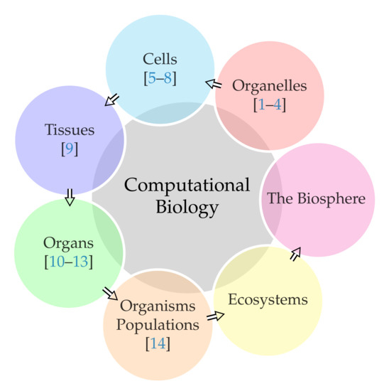 From a single organelle to the entire biosphere, living organisms are parts of a highly structured hierarchy. Some cells contain aggregates of macromolecules surrounded by membranes, called organelles (articles [1,2,3,4] in this special issue fall under this category). All living things are made of cells [5,6,7,8]. In larger organisms, cells combine to make tissues [9]. Organs are collections of tissues grouped together, performing a standard function [10,11,12,13]. Organisms are individual living entities. All the individuals of a species living within a specific area are collectively called a population [14]. An ecosystem consists of all the living things together with the non-living parts of that environment. The biosphere is the collection of all ecosystems. Furthermore, again, every entity in this hierarchy can be studied using computational algorithms and models. This special issue contains articles contributing to almost every entity (see individual references in Figure 1). The 14 articles, totaling 314 pages, in this issue, have been co-authored by 74 researchers from 12 countries.