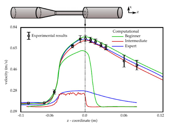 To standardize computational techniques used to assess the safety of medical devices, a worldwide benchmark study, namely the FDA’s “Critical Path” project, has been organized. The benchmark flow model used for that study consisted of a nozzle with a concentrator and sudden expansion, see the schematic in Figure 2. Over 40 groups (self-ascribed as beginner, intermediate, or expert) delivered their results. The graph in Figure 2 shows the best and worst fitting results from each group compared to experimental results from three labs. The results of the FDA study show that the computational results need to be validated even when produced by experts. It can be seen, in Figure 2, that even the worst ‘beginner’ is better than the worst ‘expert’. A rigorous approach to the development of complex modeling software packages is necessary. The modeling and analysis software packages must be reliable.