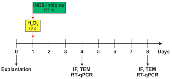 Experimental setup. Porcine retinas were cultivated for four and eight days. Oxidative stress was induced by 300 µM H2O2 on day one, for three hours. Simultaneously to the stressor, the iNOS-inhibitor treatment was applied and remained on retinal explants for 72 h. On day four, immunofluorescence (IF), transmission electron microscopy (TEM), and quantitative real-time PCR (RT-qPCR) analyses were performed. At day eight, IF, TEM, and RT-qPCR was evaluated.