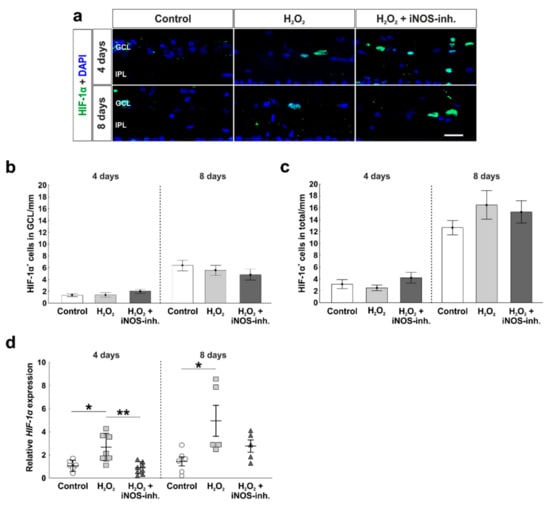 In the present work, the effect of oxidative stress and the iNOS-inhibitor 1400 W on HIF-1α was examined (Figure 2a). At four days, no statistical differences regarding the number of HIF-1α+ cells in the GCL were noted within the groups (control: 1.3 ± 0.2 HIF-1α+ cells/mm; H2O2: 1.4 ± 0.4 HIF-1α+ cells/mm; p = 0.99; H2O2 + iNOS-inh.: 2.0 ± 0.4 HIF-1α+ cells/mm; p = 0.34). At eight days, the number of HIF-1α+ cells in the GCL was higher than at four days, but still comparable in all groups (control: 6.4 ± 0.9 HIF-1α+ cells/mm; H2O2: 5.6 ± 0.8 HIF-1α+ cells/mm; p = 0.79; H2O2 + iNOS-inh.: 4.5 ± 0.9 HIF-1α+ cells/mm; p = 0.45; Figure 2b).