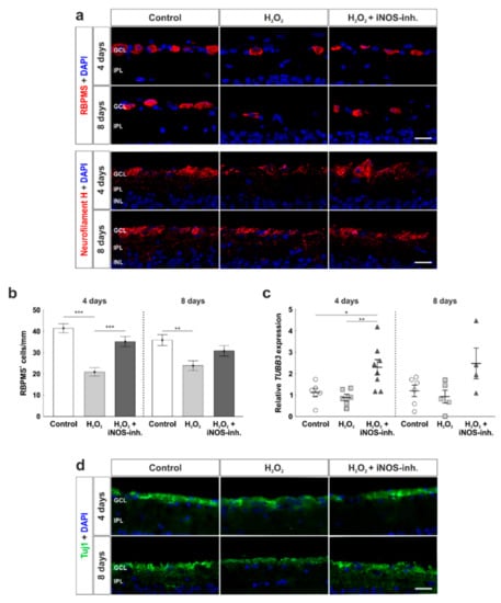 RT-qPCR was performed to evaluate mRNA expression of TUBB3 as a marker for RGCs. At four days, oxidative stress induced by H2O2 had no effect on the retinas (H2O2: 0.87 ± 0.15-fold expression; control: 1.11 ± 0.20-fold; p = 0.84). Interestingly, iNOS-inhibitor treated retinas (2.30 ± 0.36-fold) had a significantly increased expression of TUBB3 in comparison to H2O2 (p = 0.006) as well as to the control retinas (p = 0.02). At eight days, TUBB3 mRNA expression was similar in all groups (control: 1.22 ± 0.27-fold; H2O2: 0.95 ± 0.3-fold; p = 0.88; H2O2 + iNOS-inh.:2.54 ± 0.74-fold; p = 0.12). Comparing the H2O2 retinas and iNOS-inhibitor treated ones, the mRNA expression of TUBB3 was still 2.5-fold higher (p = 0.065; Figure 3c).