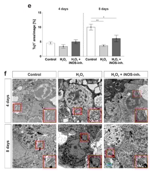 To evaluate the morphological effects of oxidative stress and the possible neuroprotective effects of the iNOS-inhibitor on RGCs and their cell compartments, transmission electron microscopy was performed. H2O2 had a strong impact on the morphology of RGCs at four and eight days. Disrupted retinal tissue with clearly damaged RGCs, in which cell nuclei were not as structured as in control retinas, were observed in both points in time. Furthermore, damages on cell compartments such as mitochondria were noted in H2O2-treated retinas. Morphologically, a neuroprotective effect of the iNOS-inhibitor was noted at four and eight days. Not only the tissue structure itself, but also cell compartments, like mitochondria, seemed to be protected by the treatment with the iNOS-inhibitor after four and eight days of cultivation (Figure 3f).