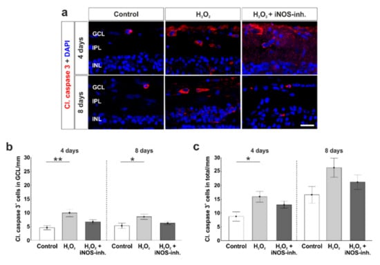 To analyze the role of apoptotic processes during the iNOS-inhibitor treatment, we used cleaved caspase 3 antibodies to label apoptotic cells (Figure 4a). At four days, the significantly increased amount of apoptotic cells in the GCL due to H2O2 (9.9 ± 1.4 cl. caspase 3+ cells/mm; p = 0.003) in comparison to the control retinas (4.6 ± 0.76 cl. caspase 3+ cells/mm) was prevented by the inhibition of iNOS (6.7 ± 0.8 cl. caspase 3+ cells/mm; p = 0.084). No statistical difference was noted between the H2O2 + iNOS-inh. group and control group (p = 0.32) and between the H2O2 + iNOS-inh. group and the H2O2 group (p = 0.084). In addition, at eight days, a significantly increased number of apoptotic cells in the H2O2 group (8.6 ± 0.9 cl. caspase 3+ cells/mm; p = 0.033) was noted in comparison to controls (5.3 ± 1.0 cl. caspase 3+ cells/mm). Again, iNOS-inhibitor treatment lowered the number of apoptotic cells in the GCL (6.3 ± 0.6 cl. caspase 3+ cells/mm), where no differences in comparison to the control group (p = 0.67) as well as to H2O2-retinas were seen (p = 0.17; Figure 4b).