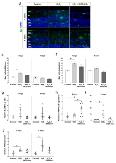 To further analyze the intrinsic apoptotic mechanisms, antibodies against Bax, a pro-apoptotic protein, were used (Figure 4d). Counts of Bax+ cells in the GCL revealed a significantly increased number of apoptotic cells in H2O2-retinas (8.0 ± 0.7 Bax+ cells/mm; p = 0.008) in comparison to the control group (4.8 ± 0.5 Bax+ cells/mm) at four days. iNOS-inhibitor treatment reduced Bax+ cell number, but this effect was not significant (6.2 ± 0.9 Bax+ cells/mm; p = 0.18). At eight days, no effects were seen neither through H2O2 nor through the iNOS-inhibitor (control: 4.3 ± 0.7 Bax+ cells/mm; H2O2: 4.1 ± 0.2 Bax+ cells/mm; p = 0.9; H2O2 + iNOS-inh.: 3.2 ± 0.3 Bax+ cells/mm; p = 0.23; Figure 4e).