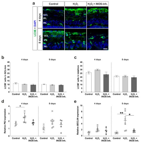 A pathway that is strongly connected to apoptosis is autophagy. Possible positive effects of the iNOS-inhibitor treatment on autophagocytotic processes were analyzed immunohistochemically by using LC3B antibodies (Figure 5a). Statistical evaluation of LC3B+ cells located in the GCL revealed a similar number of autophagocytotic cells within all three groups at four days (control: 11.4 ± 1.1 LC3B+ cells/mm; H2O2: 10.4 ± 0.4 LC3B+ cells/mm; p = 0.79; H2O2 + iNOS-inh.: 9.7 ± 1.3 LC3B+ cells/mm; p = 0.47). In addition, at eight days, no statistical differences were observed (control: 10.2 ± 0.6 LC3B+ cells/mm; H2O2: 9.4 ± 0.7 LC3B+ cells/mm; p = 0.70; H2O2 + iNOS-inh.: 9.3 ± 0.9 LC3B+ cells/mm; p = 0.65; Figure 5b).