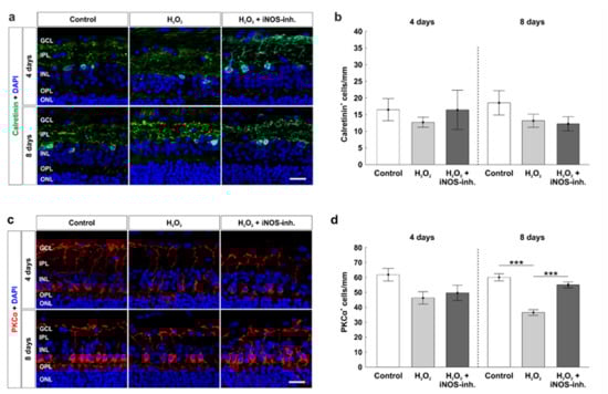 To investigate cells of the inner nuclear layer at four and eight days, which are important for the transmission of signals from photoreceptors to RGCs, we used calretinin as a specific marker for amacrine cells (Figure 6a) and PKCα for rod bipolar cells (Figure 6c). Neither oxidative stress nor the iNOS-inhibitor treatment had any impact on the amount of calretinin+ amacrine cells at four days (control: 16.7 ± 3.4 calretinin+ cells/mm; H2O2: 12.7 ± 1.5 calretinin+ cells/mm; p = 0.75; H2O2 + iNOS-inh.: 15.9 ± 5.5 calretinin+ cells/mm; p = 0.99). At eight days, the number of calretinin+ cells was still similar in all groups (control: 18.5 ± 3.6 calretinin+ cells/mm; H2O2: 13.1 ± 2.0 calretinin+ cells/mm; p = 0.35; H2O2 + iNOS-inh.: 12.2 ± 2.1 calretinin+ cells/mm; p = 0.24; Figure 6b).