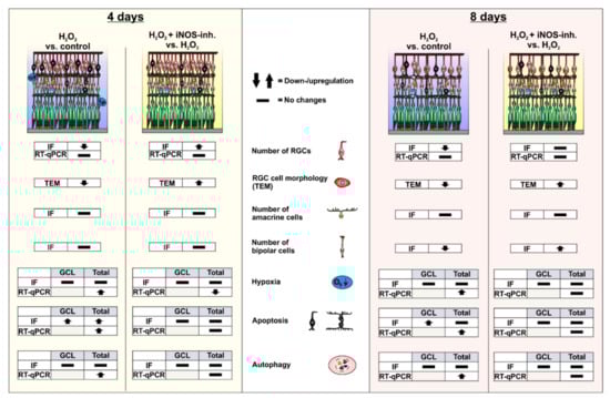Graphical summary of the results. After four days of cultivation, morphological changes in the RGCs and loss of RGCs could be observed within H2O2-stressed retinas. In line with this, there was an increase in apoptosis in the ganglion cell layer and the total retina. In addition, an increase in the expression of hypoxic and autophagic genes could be detected. The iNOS-inhibitor 1400 W was able to stop RGC loss as well as the apoptotic, hypoxic, and autophagic processes. After eight days of cultivation, a decrease in RGC and bipolar cell numbers was observed in the H2O2-retinas. Apoptotic cells could now only be detected in the retinal ganglion cell layer. The loss of both cell types as well as some apoptotic and autophagic marker were normalized by the control by 1400 W treatment. Differences in the gene expression of hypoxic and autophagic genes could no longer be noted. GCL = ganglion cell layer; IF = immunofluorescence; TEM = transmissions electron microscopy; RT-qPCR = quantitative real-time PCR; RGC = retinal ganglion cell.