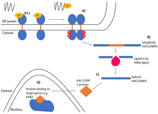- Nikawa, J.-i.; Akiyoshi, M.; Hirata, S.; Fukuda, T. Saccharomyces Cerevisiae IRE2/HAC1 Is Involved in IRE1-Mediated KAR2 Expression. Nucleic Acids Res. 1996, 24, 4222–4226. [Google Scholar] [CrossRef]
