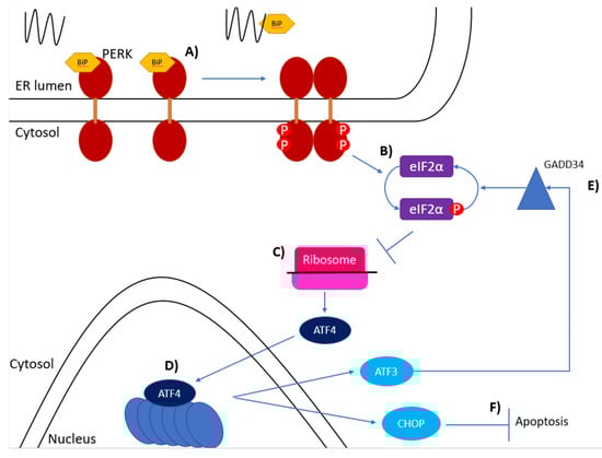The PERK pathway of the unfolded protein response. (A) BiP bound to the luminal domain of PERK dissociates when unfolded proteins accumulate allowing oligomerisation and phosphorylation of the PERK monomers. (B) Phosphorylated PERK then phosphorylates eIF2 on its α subunit at S51. (C) Phosphorylated eIF2α interferes with ribosomal translation of mRNA and causes downstream ORFs to be translated, such as ATF4. (D) ATF4 induces expression of ATF3 and CHOP. (E) ATF3 binds to the promoter region of GADD34 which activates a protein phosphatase which dephosphorylates eIF2α. (F) CHOP induces ER stress-induced apoptosis.