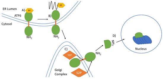 ATF6 is a type II transmembrane protein and the third pathway which plays a vital role in UPR signalling. Similarly to IRE1 and PERK, this transmembrane protein is also bound to BiP in its inactive state and requires dissociation of BiP before the signalling cascade can activate []. Regulated intermembrane proteolysis (RIP) is the process by which transmembrane proteins such as ATF6 are cleaved to release their cytoplasmic domains which then regulate gene expression by entering the nucleus [,]. The mechanism for the activation of ATF6 is best represented by the model for sterol regulatory element binding proteins (SREBPs), which are transcription factors important in the synthesis of cholesterol []. The SREBPs are also embedded in the ER membrane with their NH2-terminal and COOH-terminal segments projecting into the cytosol and a hydrophilic loop facing the ER lumen which is similar to ATF6 as its NH2 domain also projects into the cytosol []. The next step for SREBPs is to bind with SREBP cleavage activating-protein (SCAP), which transports the SREBPs to the Golgi complex, where RIP occurs [,]. Site-1 protease (S1P) is a membrane-anchored serine protease that cleaves the recognition sequence RXXL, where X can be any amino acid [,]. S1P cleavage splits the two transmembrane domains, with the NH2-terminal segment being termed as the intermediary fragment (Figure 3) []. Site-2 protease (S2P) is responsible for cleaving the intermediary fragment, which releases the NH2-terminal fragment that then localises to the nucleus and binds to promotor regions initiating gene expression (Figure 3) [,]. The same RXXL sequence has been detected in the luminal domain of ATF6 which suggests that S1P may also cleave ATF6 in a similar manner to SREBP-2 [,]. However, an equivalent molecule to SCAP has not been identified for ATF6. Therefore, the transport of ATF6 to where S1P is localised, which is usually in or near the Golgi complex, remains unknown [].