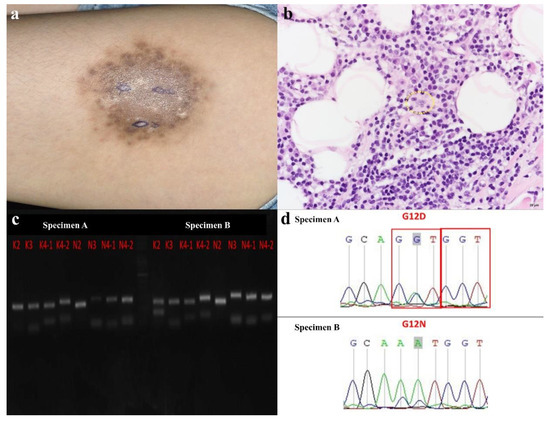 | 6 | 17/Female | Left Thigh | One 8 × 8 cm Tender Hard Brownish Plaque with Some Whitish Component for 3 Years | Small but Palpable Reactive Lymphadenopathy on Bilateral Inguinal Areas and Then Remission | Oral and Topical Corticosteroids | Specimen A: Nras G12d; Specimen B: Nras G12n, Nras A146t |