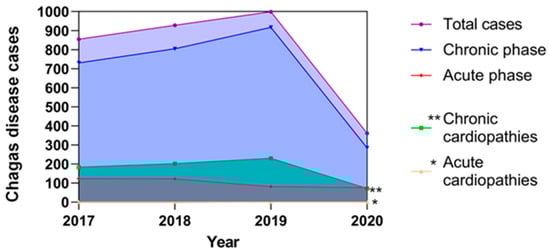 The figure represents the total reported T. cruzi infections in both acute and chronic phases; these data are based on the epidemiological bulletins published by the Ministry of Health in Mexico [12], as well as estimated cardiopathies related to Chagas disease that were predicted according to that described by Rassi et al. 2010 [19] and Bonney et al. 2019 [21], who propose that the prevalence of cardiopathies associated with Chagas disease corresponds to 25% in the chronic phase and less than 1% in the acute phase of the total of reported cases, respectively. The estimated cases of cardiopathies in the chronic phase are represented by double asterisks and with an asterisk the estimated cases of cardiopathies in the acute phase of Chagas disease.