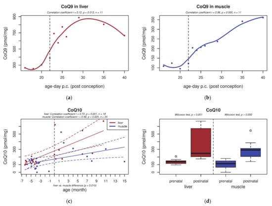 Total CoQ9 and CoQ10 content (pmol/mg protein) in rat and human tissues, respectively, during early development. (a,b) In both rat liver and skeletal muscle tissue, CoQ9 content increased significantly after birth (p ≤ 0.05); (c,d) in rats, this was not observed for CoQ10 content (data not shown). Similarly, CoQ10 content in human tissue was significantly increased after birth (p ≤ 0.05). The black dashed line indicates the last foetal day/birth. The red and blue dashed lines indicate 95% confidence intervals in the liver and skeletal muscle, respectively.