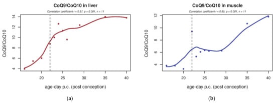 At the CoQ content level, findings in both the rat model and human tissues showed a similar trend, even though there are some limitations of using human autopsies from foetuses with genetic indications: the total CoQ content is low prenatally, significantly increasing after birth in both the liver and skeletal muscle (Figure 1). A significant increase in CoQ10 was already shown in the plasma of newborns [18], reaching normal adult levels within the first month of life in clinically “stable” infants.