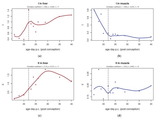 In human tissues, the activities of complexes I–III and II–III (Figure A1a,b) decreased between the 13th and 28th week of gestation (see Appendix A). This prenatal decreasing trend is similar to the findings in rat skeletal muscle (although not significant).