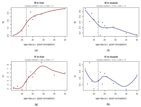 Tissue-specific changes in electron transport chain (ETC) complexes’ activities in rat liver and skeletal muscle during early development. (a,c,e) In the liver, enzyme activities of ETC complexes significantly increased after birth. (b,d,f) In skeletal muscle, only the activities of complexes I (b) and III (f) changed, decreasing significantly after birth (p ≤ 0.05). (g) In the liver, complex IV activity significantly increased after birth (p ≤ 0.05). (h) In skeletal muscle, complex IV activity did not significantly change after birth. Enzyme activities normalised to citrate synthase are shown. The dashed line indicates the last foetal day/birth. Enzyme activities normalised to citrate synthase are shown. The dashed line indicates the last foetal day/birth. I—NADH:coenzyme Q10 oxidoreductase, II—succinate:coenzyme Q10 oxidoreductase, III—Coenzyme Q10:cytochrome c oxidoreductase, IV—cytochrome c oxidase.