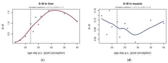 Tissue-specific changes in electron transport chain (ETC) complexes’ coupled activities in foetal human liver and skeletal muscle. In the liver (red) and in skeletal muscle (blue), coupled activities of complexes I–III (a) and II–III (b) were decreasing between the 13th and 28th week of gestation, but not significantly. Enzyme activities are shown as specific activity (nmol/min/mg). Statistical analyses were performed in STATISTICA 12.0 (StatSoft, Tulsa, OK, USA) and R (“R Core Team” URL: http://www.r-project.org/ accessed on 3 May 2021). The dashed line indicates 95% confidence level. I–III—NADH:cytochrome c oxidoreductase, II–III—succinate:cytochrome c oxidoreductase.