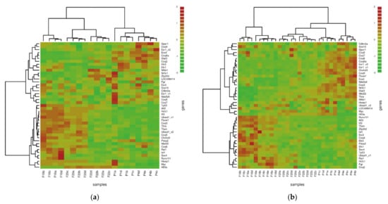 For Pearson’s correlation-based hierarchical clustering of genes, data were transposed and auto-scaled in GenEx (MultiD Analyzes AB, Göteborg, Sweden). Ward’s algorithm was chosen as a clustering method according to Pearson’s correlation coefficient distance to construct the heatmap in R (“R Core Team” URL: http://www.r-project.org/ accessed on 3 May 2021).