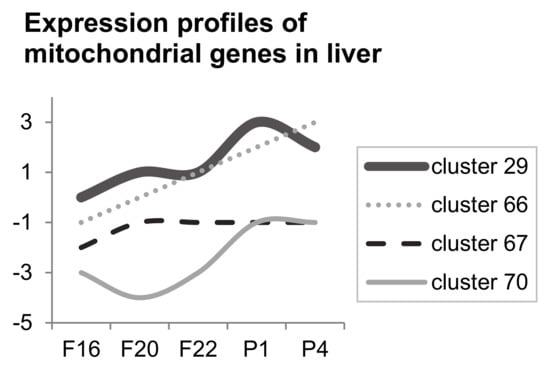 From the STEM results, we analysed the genes annotated with the GO term “mitochondrion” (GO:0005739), identifying 164 genes to be co-clustered in profiles with significantly more genes than expected in the liver. The expression changes in these genes resembled the following profiles: cluster 29—(0.0, 1.0, 1.0, 3.0, 2.0), cluster 66—(0.0, 1.0, 2.0, 3.0, 4.0), cluster 67—(0.0, 1.0, 1.0, 1.0, 1.0) and cluster 70—(0.0, −1.0, 1.0, 2.0, 2.0) (see the profiles of these clusters during the observed period in Figure 6). Only 12 of these genes decreased their expression during development, and the decrease was observed prenatally (between F16 and F22). All co-clustered genes showed a higher expression after birth than at F16. In skeletal muscle, the same analysis revealed the GO:0005739 “mitochondrion” to be significantly changed per se, but no specific profiles were identified. The list of genes clustered to clusters 29, 66, 67 and 70 is attached in the Supplementary Material (Table S1).