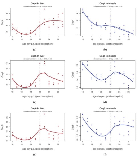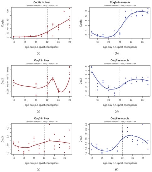 Nevertheless, only a few studies have analysed the expression of mitochondrial genes during perinatal and early postnatal development [29,30]. Mitochondrial gene expression changes have been thoroughly reported in human foetal liver and skeletal muscle mtDNA expression and maintenance [9], but an adequate mapping of mitochondrial biogenesis in the perinatal period is still missing, with the exception of the β-F1-ATPase subunit, which was shown to be regulated at the transcriptional level during foetal development [31,32]. Our pilot study described the orchestration of mRNA expression of 20 genes important to ATPase biogenesis and mitochondrial oxidative metabolism in the liver and muscle tissue during rat perinatal development (Rattus norvegicus Berkenhout, 1769, var. alba; Wistar albino rat) [33]. We aimed to study changes in mitochondrial metabolism in perinatal period regardless of tissue type; therefore, skeletal muscle was chosen as a model tissue whose function stays generally unchanged throughout the mammalian perinatal period [33]. On the other hand, during the prenatal and perinatal periods, the liver plays several roles—haematopoiesis (already starting at F14 according to [34]), and fatty acid β-oxidation and other metabolic pathways, which considerably fluctuate during ontogenesis. Together with using the data obtained in human foetuses, we decided to apply a broad RNA microarray analysis to find specific interconnections of transcriptional regulators or activators with an emphasis on CoQ biosynthesis. We believe that these data may enable the identification of further key factors regulating mitochondrial activation, and also improve diagnostics of metabolic disorders and care in preterm newborns.
