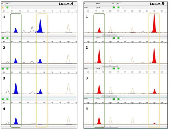 Electropherograms showing amplicons at two polymorphic loci between the TV and Odisseo. The green line highlights the TV alleles, while the yellow line highlights the Odisseo alleles. Plots of Locus A and Locus B from 1 to 4 show the electropherogram obtained from the pasta samples (1: TV 20%–Odisseo 80%, 2: TV 50%–Odisseo 50%; 3: TV 70%–Odisseo 30%; 4: TV 90%–Odisseo 10%).